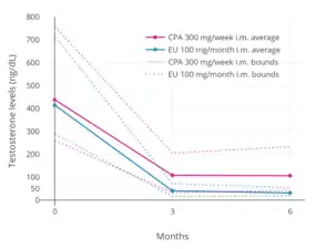 An expanded report of 191 patients, which included the 42 patients from the University of Mainz center plus an additional 149 patients from 11 other centers, was published in 1982.[41][47] The antitumor effectiveness of estradiol undecylate and cyproterone acetate in this study was equivalent.[41][43][55][44][25][45] The rates of improvement, no response, and deterioration were 52%, 41%, and 7% in the estradiol undecylate group and 48%, 44%, and 8% in the cyproterone acetate group, respectively.[41][44] However, the incidence of a selection of specific side effects, including gynecomastia, breast tenderness, edema, and thrombosis, was significantly lower in the cyproterone acetate group than in the estradiol undecylate group (37% vs. 94%, respectively).[41][43][44][56] Gynecomastia specifically occurred in 13% (12/96) of the patients in the cyproterone acetate group and 77% (73/95) of the patients in the estradiol undecylate group.[41][43] Erectile dysfunction occurred in "essentially all" patients in both groups.[47] Leg edema occurred in 18% (17/95) of the estradiol undecylate group and 4.2% (4/96) of the cyproterone acetate group, while the incidences of superficial thrombophlebitis and coronary heart disease both were not described.[41] The incidence of thrombosis was 4.2% (4/95) in the estradiol undecylate group and 5.3% (5/96) in the cyproterone acetate group.[41][46][47] There were five deaths in total, three in the estradiol undecylate group and two in the cyproterone acetate group.[41] Two of the deaths in each of the treatment groups were due to cardiovascular events, while the remaining death in the estradiol undecylate group was due to unknown causes.[41][44][47] The similar rate of cardiovascular complications besides edema between estradiol undecylate and cyproterone acetate that was observed is in contrast to the initial 42-patient report and to findings with other estrogens, such as diethylstilbestrol and estramustine phosphate, which have been shown to possess significantly higher cardiovascular toxicity than cyproterone acetate.[43] On the basis of the expanded study, the researchers concluded that cyproterone acetate was an "acceptable alternative" to estrogen therapy with estradiol undecylate, but with a "considerably more favorable" side-effect profile.[44]
