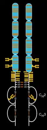 Etanercept is made from the combination of two naturally occurring soluble human 75-kilodalton TNF receptors linked to an Fc portion of an IgG1.[22] The effect is an artificially engineered dimeric fusion protein.[22] Etanercept is a complex molecule containing 6 N-glycans, up to 14 O-glycans and 29 disulfide bridge structures.[23][24][25]
