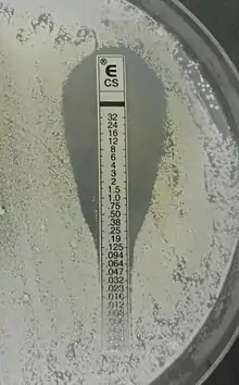 Etest (previously known as the Epsilometer test) is a way of determining antimicrobial sensitivity by placing a strip impregnated with antimicrobials onto an agar plate. A strain of bacterium or fungus will not grow near a concentration of antibiotic or antifungal if it is sensitive. For some microbial and antimicrobial combinations, the results can be used to determine a minimum inhibitory concentration (MIC). Etest is a proprietary system manufactured by bioMérieux. It is a laboratory test used in healthcare settings to help guide physicians by indicating what concentration of antimicrobial could successfully be used to treat patients' infections.[1]