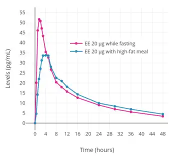Modern COCs contain 10 to 35 μg EE, but typically 20, 30, or 35 μg.[38][41] The initial formulations of COCs that were introduced in the 1960s contained 100 to 150 μg EE.[42][32][41] However, it was soon found that EE is associated with increased risk of VTE and that the risk is dose-dependent.[41] Following these events, the dose of EE was greatly reduced, and is now always less than 50 μg.[43][44][45] These lower doses have a significantly reduced risk of VTE with no loss of contraceptive effectiveness.[41] Gerstman et al. (1991) found that COCs containing more than 50 μg EE had 1.7-fold and COCs containing 50 μg EE 1.5-fold the risk of VTE of COCs containing less than 50 μg.[30] A 2014 Cochrane review found that COCs containing 50 μg EE with levonorgestrel had 2.1- to 2.3-fold the risk of COCs containing 30 μg or 20 μg EE with levonorgestrel, respectively.[38] COCs containing 20 μg EE are likewise associated with a significantly lower risk of cardiovascular events than COCs containing 30 or 40 μg EE.[46] However, discontinuation of COCs is more common with doses of EE from 10 to 20 μg due to problematic changes in bleeding patterns.[47]