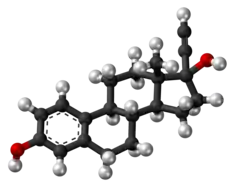 Ethinylestradiol (EE) is an estrogen medication which is used widely in birth control pills in combination with progestins.[8][9] In the past, EE was widely used for various indications such as the treatment of menopausal symptoms, gynecological disorders, and certain hormone-sensitive cancers. It is usually taken by mouth but is also used as a patch and vaginal ring.[8][12]