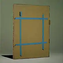 The album cover is titled Necrotomigaud.[31] The artwork is generally thought to be a depiction of an empty canvas or the back of a picture frame with four strips of blue painter's tape, being described by Andrew Ryce as "meaningless and flattening."[44] It is also thought to be the patient being reduced to a completely blank canvas, with some commentators adding that the invisibility of the other side is a representation of all the life experiences of the patient no longer being accessible to them, due to the late stages of dementia having "destroyed" their ability to think.[30] However, Sydney Leahy's article on Everywhere at the End of Time stated the artwork depicts "a singular art board with four pieces of blue tape," adding it also serves as "the embodiment of nothingness."[25]