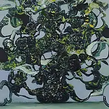 "[Ivan] Seal and the Caretaker have a history. Both are from England and spent time together in Berlin, and they collaborated on a number of record covers for a project that just wrapped up with a six-album series devoted to thinking through memory loss and dementia. Music by the Caretaker (whose name is a nod to a spectral character in the 1980 Stanley Kubrick film The Shining) tends toward technologically altered reminiscences of the old-fashioned, with sounds of vintage ballroom waltzes and parlor tunes from 1930s-era 78-rpm records edited and processed into simultaneously straightforward and ghostly lull. And paintings by Seal tend toward the uncanny, with a representational simplicity locked in a tense duel with a habit for seeming to always be silently thinking out loud. Together, their work in different mediums found a match."[50]