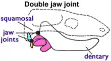 Eventually, the dentary bone evolved to make contact with the squamosal, a bone in the upper jaw located anterior to the quadrate, allowing two simultaneous jaw joints:[31] an anterior "mammalian" joint between the dentary and squamosal and a posterior "reptilian" joint between the quadrate and articular. This "twin-jointed jaw" can be seen in late cynodonts and early mammaliforms.[32] Morganucodon is one of the first discovered and most thoroughly studied of the mammaliforms, since an unusually large number of morganucodont fossils have been found. It is an example of a nearly perfect evolutionary intermediate between the mammal-like reptiles and extant reptiles.[33]