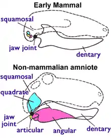 Early amniotes had a jaw joint composed of the articular (a small bone at the back of the lower jaw) and the quadrate (a small bone at the back of the upper jaw). All non-mammalian amniotes use this system including lizards, crocodilians, dinosaurs (and their descendants the birds) and therapsids; so the only ossicle in their middle ears is the stapes. The mammalian jaw joint is composed of different skull bones, including the dentary (the lower jaw bone which carries the teeth) and the squamosal (another small skull bone). In mammals, the quadrate and articular bones have evolved into the incus and malleus bones in the middle ear.[20][21]
