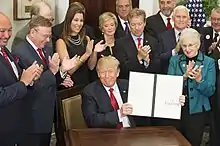Following the failure of Congress to repeal the ACA through legislation, Trump issued the new order. Both supporters and critics asserted that the provisions of the order were intended to redefine the American health care market and effectively replace Obamacare with a new health care regime.[4][33] Trump briefly forgot to sign the order before leaving the signing ceremony, but was ushered back to the table by Vice President Mike Pence to complete this step.[34] Senator Rand Paul, who attended the signing, described the order as "the biggest free market reform of health care in a generation".[33]