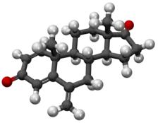 Exemestane is quickly absorbed from the gut, but undergoes a strong first-pass effect in the liver. Highest blood plasma concentrations are reached after 1.2 hours in breast cancer patients and after 2.9 hours in healthy subjects. Maximal aromatase inhibition occurs after two to three days.[10] 90% of the absorbed substance are bound to plasma proteins. The liver enzyme CYP3A4 oxidizes the methylidene group in position 6, and the 17-keto group (on the five-membered ring) is reduced by aldo-keto reductases to an alcohol. Of the resulting metabolites, 40% are excreted via the urine and 40% via the feces within a week. The original substance accounts for only 1% of excretion in the urine. The terminal half-life is 24 hours.[6][13]