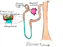 When the protein reaches the kidneys it causes a strain on the anatomical structures reducing its effectiveness as a filter for the body. The protein acts like a dam as it forms into tight aggregates when it enters the renal tubules.[9] In addition, the increased intracellular calcium has greater time to bind due to the blockage allowing for renal calculi to form.[10] As a result this causes urine output to decrease allowing for the uric acid to build up inside the organ. The increased acid concentration allows the iron from the aggregate protein to be released into the surrounding renal tissue.[11] Iron then strips away molecular bonds of the surrounding tissue which eventually will lead to kidney failure if the tissue damage is too great.