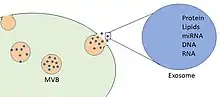 Exosomes can transfer molecules from one cell to another via membrane vesicle trafficking, thereby influencing the immune system, such as dendritic cells and B cells, and may play a functional role in mediating adaptive immune responses to pathogens and tumors.[18][19] Therefore, scientists who are actively researching the role that exosomes may play in cell-to-cell signaling, often hypothesize that delivery of their cargo RNA molecules can explain biological effects. For example, mRNA in exosomes has been suggested to affect protein production in the recipient cell.[16][20][21] However, another study has suggested that miRNAs in exosomes secreted by mesenchymal stem cells (MSC) are predominantly pre- and not mature miRNAs.[22] Because the authors of this study did not find RNA-induced silencing complex-associated proteins in these exosomes, they suggested that only the pre-miRNAs, but not the mature miRNAs in MSC exosomes, have the potential to be biologically active in the recipient cells. Multiple mechanisms have been reported to be involved in loading miRNAs into exosomes, including specific motifs in the miRNA sequences, interactions with lncRNAs localized to the exosomes, interactions with RBPs, and post-translational modifications of Ago.[23]