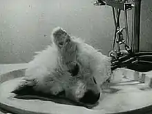 Experiments in the Revival of Organisms (Russian: Эксперименты по оживлению организма) is a 1940 motion picture which documents Soviet research into the resuscitation of clinically dead organisms.[1] It is available from the Prelinger Archives, and it is in the public domain. The operations are credited to Doctor Sergei Brukhonenko and Boris Levinskovsky, who were demonstrating a special heart-lung apparatus called the autojektor, also referred to as the heart-lung machine, to the Second Congress of Russian Pathologists in Moscow.[2] It was filmed at the Institute of Experimental Physiology and Therapy, which is also in Moscow.[3] The heart-lung machine was designed and constructed by Brukhonenko, whose work in the film is said to have led to the first operations on heart valves.[4] The autojektor device demonstrated in the film is similar to modern ECMO machines, as well as the systems commonly used for renal dialysis in modern nephrology.