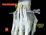 Opposite the metacarpophalangeal articulation each tendon is bound by fasciculi to the collateral ligaments and serves as the dorsal ligament of this joint; after having crossed the joint, it spreads out into a broad aponeurosis, which covers the dorsal surface of the first phalanx and is reinforced, in this situation, by the tendons of the interossei and lumbricalis.[4]
