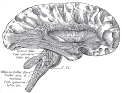 ![]() Deep dissection of cortex and brain-stem. (External capsule visible at center.) | |