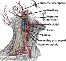 The external carotid artery is a major artery of the head and neck. It arises from the common carotid artery when it splits into the external and internal carotid artery. External carotid artery supplies blood to the face and neck.[1]