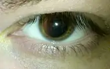 A red reflex can be seen when looking at a patient's pupil through a direct ophthalmoscope. This part of the examination is done from a distance of about 50 cm and is usually symmetrical between the two eyes. An opacity may indicate a cataract.