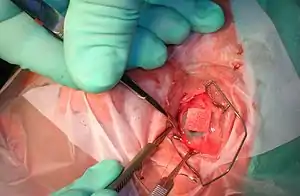 Eye surgery, also known as ocular surgery, is surgery performed on the eye or its adnexa, typically by an ophthalmologist.[1] The eye is a very fragile organ, and requires extreme care before, during, and after a surgical procedure to minimise or prevent further damage. An expert eye surgeon is responsible for selecting the appropriate surgical procedure for the patient, and for taking the necessary safety precautions. Mentions of eye surgery can be found in several ancient texts dating back as early as 1800 BC, with cataract treatment starting in the fifth century BC.[2] Today it continues to be a widely practiced type of surgery, with various techniques having been developed for treating eye problems.