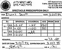 An eyeglass prescription is an order written by an eyewear prescriber, such as an optometrist, that specifies the value of all parameters the prescriber has deemed necessary to construct and/or dispense corrective lenses appropriate for a patient. If an examination indicates that corrective lenses are appropriate, the prescriber generally provides the patient with an eyewear prescription at the conclusion of the exam.