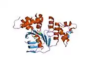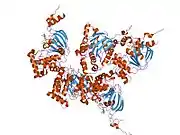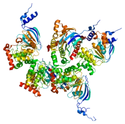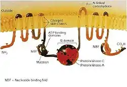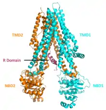 The CFTR gene is approximately 189 kb in length, with 27 exons and 26 introns.[31] CFTR is a glycoprotein with 1480 amino acids. The protein consists of five domains. There are two transmembrane domains, each with six spans of alpha helices. These are each connected to a nucleotide binding domain (NBD) in the cytoplasm. The first NBD is connected to the second transmembrane domain by a regulatory "R" domain that is a unique feature of CFTR, not present in other ABC transporters. The ion channel only opens when its R-domain has been phosphorylated by PKA and ATP is bound at the NBDs.[32] The carboxyl terminal of the protein is anchored to the cytoskeleton by a PDZ-interacting domain.[33] The structure shown (PDB# 1XMI) shows a homopentameric assembly of mutated NBD1, the first nucleotide binding domain (NBD1) of the transporter.