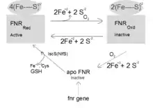 Interconversion of active and inactive FNR is a reversible process. The oxygen-sensing domain of FNR contains a surface-exposed Fe-S cluster, which can react with cellular reductants, such as glutathione or thiol proteins. The IscS isoenzyme (iscS gene) is one of the most important requirements for formation of [4Fe–4S].FNR in vivo.[2] The formation of [4Fe–4S] FNR from apoFNR is part of de novo synthesis of active FNR. The reaction requires cysteine desulphurase which catalyzes desulphuration of the cysteine providing HS- (presumably via enzyme bound persulphide) for the FeS cluster formation. Whether glutathione supports also the conversion of [2Fe–2S].FNR to [4Fe–4S].FNR is not known. Under anoxic conditions, the [4Fe-4S].FNR, bound to 4 cysteine residues binds to DNA target sites, and controls the expression of corresponding genes.