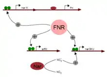 In Escherichia coli, the anaerobic expression of genes encoding the nitrate (narGHJI) and dimethyl sulphoxide (dmsABC) terminal reductases is stimulated by the global anaerobic regulator- FNR. The ability of FNR to activate transcription initiation has been proposed to be dependent on protein–protein interactions between RNA polymerase and two activating regions (AR) of FNR, FNR-AR1 and FNR-AR3. Also, in the presence of activated narL, the effect of FNR binding to the RNAP is decreased greatly.[7]