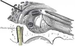 The facial canal (Canalis nervi facialis), also known as the Fallopian canal,[1] first described by Gabriele Falloppio, is a Z-shaped canal running through the temporal bone from the internal acoustic meatus to the stylomastoid foramen. In humans it is approximately 3 centimeters long, which makes it the longest human osseous canal of a nerve.[2] It is located within the middle ear region, according to its shape it is divided into three main segments: the labyrinthine, the tympanic, and the mastoidal segment.[3] It contains Cranial Nerve VII, also known as the facial nerve.