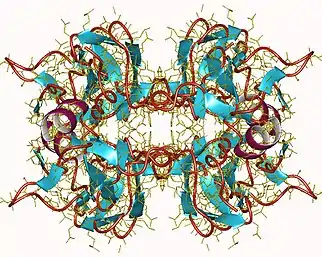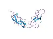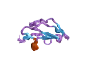 The molecule is made up of 20 complement control protein (CCP) modules (also referred to as Short Consensus Repeats or sushi domains) connected to one another by short linkers (of between three and eight amino acid residues) and arranged in an extended head to tail fashion. Each of the CCP modules consists of around 60 amino acids with four cysteine residues disulfide bonded in a 1–3 2-4 arrangement, and a hydrophobic core built around an almost invariant tryptophan residue. The CCP modules are numbered from 1–20 (from the N-terminus of the protein); CCPs 1–4 and CCPs 19–20 engage with C3b while CCPs 7 and CCPs 19–20 bind to GAGs and sialic acid.[11] To date atomic structures have been determined for CCPs 1–3,[12] CCP 5,[13] CCP 7,[14] CCPs 10–11 and CCPs 11–12,[15] CCPs 12–13,[16] CCP 15, CCP 16,[17] CCPs 15–16,[18] CCPs 18–20,[19] and CCPs 19–20.[20][21] The atomic structure for CCPs 6–8 bound to the GAG mimic sucrose octasulfate,[22] CCPs 1–4 in complex with C3b[23] and CCPs 19–20 in complex with C3d (that corresponds to the thioster domain of C3b)[24][25] have also been determined. Although an atomic resolution structure for intact factor H has not yet been determined, low resolution techniques indicate that it may be bent back in solution.[26] Information available to date indicates that CCP modules 1–4 is responsible for the cofactor and decay acceleration activities of factor H, whereas self/non-self discrimination occurs predominantly through GAG binding to CCP modules 7 and/or GAG or sialic acid binding to 19–20.[26][27]