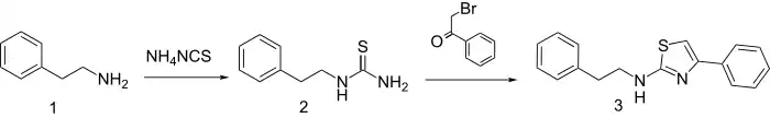 Reaction of β-phenethylamine with ammonium isothiocyanate gives the thiourea (2) Treatment of that product with phenacyl bromide thus affords the thiazole product.