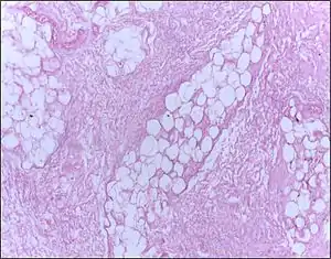 | Micrograph of breast tissue showing fat necrosis. H&E stain | |