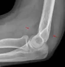 The fat pad sign, also known as the sail sign, is a potential finding on elbow radiography which suggests a fracture of one or more bones at the elbow. It is may indicate an occult fracture that is not directly visible. Its name derives from the fact that it has the shape of a spinnaker (sail).[1] It is caused by displacement of the fat pad around the elbow joint. Both anterior and posterior fat pad signs exist, and both can be found on the same X-ray.