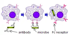 Fc receptors are found on a number of cells in the immune system including phagocytes like macrophages and monocytes, granulocytes like neutrophils and eosinophils, and lymphocytes of the innate immune system (natural killer cells) or adaptive immune system (e.g., B cells).[17][18][19] They allow these cells to bind to antibodies that are attached to the surface of microbes or microbe infected cells, helping these cells to identify and eliminate microbial pathogens. The Fc receptors bind the antibodies at their Fc region (or tail), an interaction that activates the cell that possesses the Fc receptor.[20] Activation of phagocytes is the most common function attributed to Fc receptors. For example, macrophages begin to ingest and kill an IgG-coated pathogen by phagocytosis following engagement of their Fcγ receptors.[21] Another process involving Fc receptors is called antibody-dependent cell-mediated cytotoxicity (ADCC). During ADCC, FcγRIII receptors on the surface of natural killer (NK) cells stimulate the NK cells to release cytotoxic molecules from their granules to kill antibody-covered target cells.[22] FcεRI has a different function. FcεRI is the Fc receptor on granulocytes, that is involved in allergic reactions and defense against parasitic infections. When an appropriate allergic antigen or parasite is present, the cross-linking of at least two IgE molecules and their Fc receptors on the surface of a granulocyte will trigger the cell to rapidly release preformed mediators from its granules.[3]