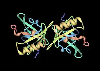 Mups are members of a large family of low-molecular weight (~19 kDa) proteins known as lipocalins.[25] They have a characteristic structure of eight beta sheets arranged in an anti-parallel beta barrel open on one face, with alpha helices at both ends.[25] Consequently, they form a characteristic glove shape, encompassing a cup-like pocket that binds small organic chemicals with high affinity.[1][26] A number of these ligands bind to mouse Mups, including 2-sec-butyl-4,5-dihydrothiazole (abbreviated as SBT or DHT), 6-hydroxy-6-methyl-3-heptanone (HMH) and 2,3 dihydro-exo-brevicomin (DHB).[27][28][29] These are all urine-specific chemicals that have been shown to act as pheromones—molecular signals excreted by one individual that trigger an innate behavioural response in another member of the same species.[27][30] Mouse Mups have also been shown to function as pheromone stabilizers, providing a slow release mechanism that extends the potency of volatile pheromones in male urine scent marks.[31] Given the diversity of Mups in rodents, it was originally thought that different Mups may have differently shaped binding pockets and therefore bind different pheromones. However, detailed studies found that most variable sites are located on the surface of the proteins and appear to have little effect on ligand binding.[32]