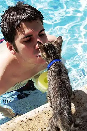People can acquire cat-associated infections through bites, scratches or other direct contact of the skin or mucous membranes with the cat. This includes 'kissing' or letting the animal lick the mouth or nose. Mucous membranes are easily infected when the pathogen is in the mouth of the cat. Pathogens can also infect people when there is contact with animal saliva, urine and other body fluids or secretions, When fecal material is unintentionally ingested, infection can occur. A feline zooinosis can be acquired by a person by inhalation of aerosols or droplets coughed up by the cat.[2][3]