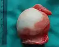 The femoral head's surface is smooth. It is coated with cartilage in the fresh state, except over an ovoid depression, the fovea capitis, which is situated a little below and behind the center of the femoral head, and gives attachment to the ligament of head of femur.