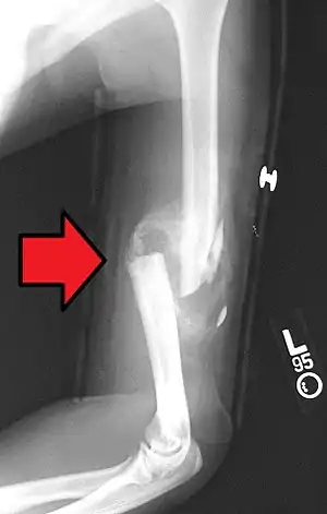 A fibrocartilage callus is a temporary formation of fibroblasts and chondroblasts which forms at the area of a bone fracture as the bone attempts to heal itself. The cells eventually dissipate and become dormant, lying in the resulting extracellular matrix that is the new bone. The callus is the first sign of union visible on x-rays, usually 3 weeks after the fracture. Callus formation is slower in adults than in children, and in cortical bones than in cancellous bones.[1]