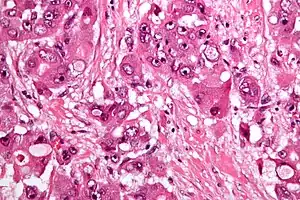 | Micrograph of fibrolamellar hepatocarcinoma showing the characteristic laminated fibrosis between the tumor cells with a low NC ratio. H&E stain. | |