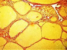 Micrograph showing cirrhosis of the liver. The tissue in this example is stained with a trichrome stain, in which fibrosis is colored blue. The red areas are the nodular liver tissue