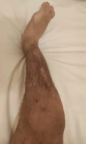 Fibular hemimelia or longitudinal fibular deficiency is "the congenital absence of the fibula and it is the most common congenital absence of long bone of the extremities."[1][2] It is the shortening of the fibula at birth, or the complete lack thereof. Fibula Hemimelia is a catastrophic deformity of the leg which often causes severe knee instability due to the absence of multiple ligaments including the ACL and lack of functionality in any remaining ligaments. Severe forms of Fibula Hemimelia in a patient can result in a non functional locked and malformed ankle which is significantly smaller as well as missing toes. This condition also results in a warped leg which lacks circulation and has nerve damage. In many cases of the deformity almost all types of tissue within the patients leg are deformed and seriously affected. It can lead to serious and debilitating problems and has a significant impact on a patients quality of life.[3] In humans, the disorder can be noted by ultrasound in utero to prepare for amputation after birth or complex bone lengthening surgery. The amputation usually takes place at six months with removal of portions of the legs to prepare them for prosthetic use. The other treatments which include repeated corrective osteotomies and leg-lengthening surgery (Ilizarov apparatus) are costly and associated with residual deformity.[4] It is noted however that these treatments have very little effect on the multitude of problems such as severe knee instability that fibula hemimelia causes. Fibula Hemimelia is a degenerative and lifelong condition which can result in a leg which is unable to bear any weight and can rapidly worsen without any acute injuries.[5]