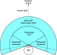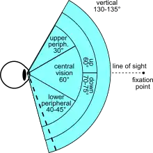 If the analogy of the eye's retina working as a sensor is drawn upon, the corresponding concept in human (and much of animal vision) is the visual field.[3] It is defined as "the number of degrees of visual angle during stable fixation of the eyes".[4] Note that eye movements are excluded in the definition. Different animals have different visual fields, depending, among others, on the placement of the eyes. Humans have a slightly over 210-degree forward-facing horizontal arc of their visual field,[5][6] while some birds have a complete or nearly complete 360-degree visual field. The vertical range of the visual field in humans is around 150 degrees.[5]