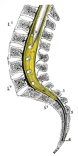 Sagittal section of vertebral canal to show the lower end of the medulla spinalis and the filum terminale.