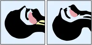 Whether conscious or not, the patient may be placed in the recovery position, laying on their side. In addition to relaxing the patient, this can have the effect of clearing the tongue from the pharynx. It also avoids a common cause of death in unconscious patients, which is choking on regurgitated stomach contents.