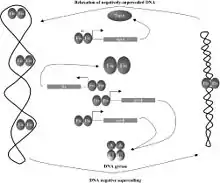 Fis has been deemed a bacterial chromatin architectural protein.[11] Besides modulating chromatin architecture, it is known to influence numerous promoters of E. coli and several other bacteria. Both in vivo and in vitro studies indicate that Fis acts as a transcriptional repressor of ''mom'' promoter. There is data that shows Fis mediates its repressive effect by denying access to RNA polymerase at the mom promoter. combined A repressive effect of Fis and previously characterized negative regulatory factors could be responsible to keep the gene silenced most of the time. In addition to bringing about overall downregulation of the Mu genome, it also ensures silencing of the advantageous but potentially lethal mom gene.[12]