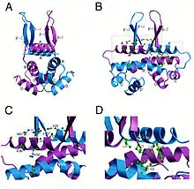 Structurally, Fis folds into four α-helices (A–D) and a β-hairpin. Helices A and B provide the contacts between Fis monomers, facilitating dimer formation, whereas the C and D helices form a helix-turn-helix motif that is essential for DNA binding.[3]