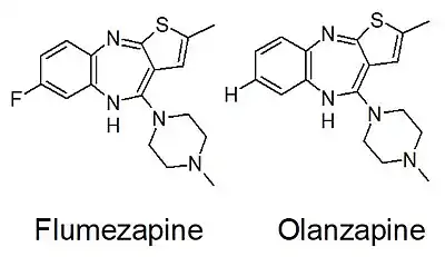 Flumezapine is a thioeno[2,3-b][1,5]benzodiazepine akin to olanzapine, differing only by the substitution of a fluorine atom (F) for a hydrogen atom (H) on the phenyl ring.[4] The fluorine atom acts as an electron-withdrawing substituent; this was the same rationale given in the patent information for the electron-withdrawing chlorine atom on the antipsychotic clozapine.[5]