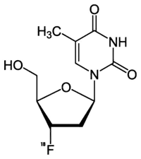 Fluorothymidine F-18 (FLT) is a tumor-specific PET tracer and radiopharmaceutical. It is an isotopologue of alovudine. FLT is suitable for monitoring how tumors respond to cytostatic therapy. FLT accumulates in proliferating cells where it indicates the activity of the enzyme thymidine kinase. Cell division can be characterized by the activity of that enzyme. FLT is phosphorylated as though it were thymidine, and is subsequently incorporated into DNA. Thymidine is essential for DNA replication. Considering that FLT lacks a 3′-hydroxy group, transcription of DNA is impeded following incorporating of FLT. FLT indicates changes in tumor cell proliferation by tracking the restoration of nucleosides from degenerated DNA.[1]