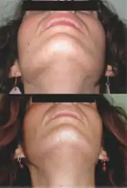 Improvement of facial hirsutism in a woman with hyperandrogenism before (top) and after (bottom) treatment with 125 mg/day flutamide and an oral contraceptive for 6 months (click image to view a larger version).[34]:368