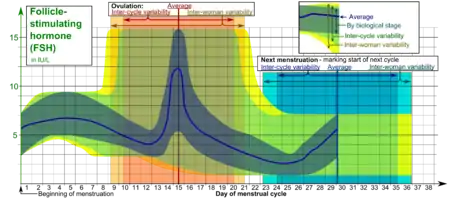 Reference ranges for the blood content of follicle-stimulating hormone levels during the menstrual cycle.[11]