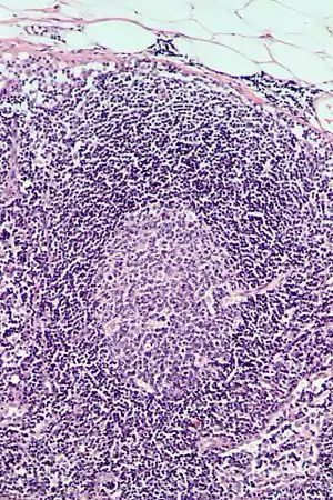 Follicular hyperplasia (FH) is a type of lymphoid hyperplasia and is classified as a lymphadenopathy, which means a disease of the lymph nodes. It is caused by a stimulation of the B cell compartment and by abnormal cell growth of secondary follicles. This typically occurs in the cortex without disrupting the lymph node capsule.[1] The follicles are pathologically polymorphous, are often contrasting and varying in size and shape.[2] Follicular hyperplasia is distinguished from follicular lymphoma in its polyclonality and lack of bcl-2 protein expression, whereas follicular lymphoma is monoclonal, and expresses bcl-2.[3]