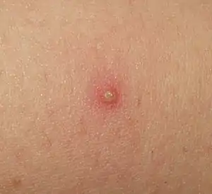 Folliculitis is the infection and inflammation of one or more hair follicles. The condition may occur anywhere on hair covered skin. The rash may appear as pimples that come to white tips on the face, chest, back, arms, legs, buttocks, or head.[1]