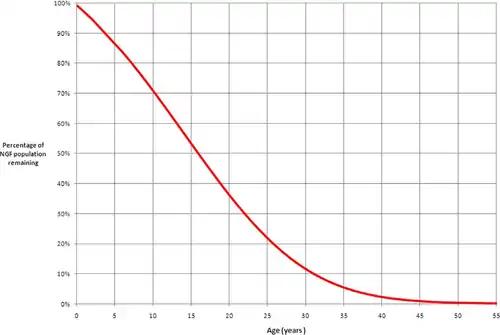 "Percentage of ovarian reserve related to increasing age. The curve describes the percentage of ovarian reserve remaining at ages from birth to 55 years, based on the ADC model. 100% is taken to be the maximum ovarian reserve, occurring at 18–22 weeks post-conception. The percentages apply to all women whose ovarian reserve declines in line with our model (i.e. late and early menopause are associated with high and low peak NGF populations, respectively). We estimate that for 95% of women by the age of 30 years only 12% of their maximum pre-birth NGF population is present and by the age of 40 years only 3% remains. doi:10.1371/journal.pone.0008772.g005"[9]