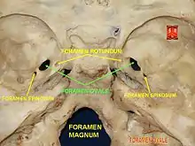 - Yanagi S (1987). "Developmental studies on the foramen rotundum, foramen ovale and foramen spinosum of the human sphenoid bone". The Hokkaido Journal of Medical Science. 62 (3): 485–96. PMID 3610040.