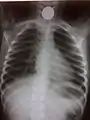 Chest radiograph showing a Venezuelan 25 cent coin lodged in the upper esophagus of a 9-year-old girl.